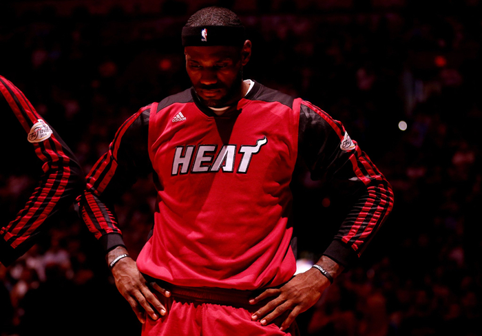 尽管在迈阿密的四年间,詹姆斯首次品尝到了登顶的滋味,赢得了两座总冠军奖杯、两座常规赛MVP奖杯,个人技术臻于化境,但球队的竞争力已现颓势,阵容老化、天赋不足的问题显露无遗——13-14赛季的热火百回合净胜分创造了詹姆斯加盟后的最低值,球队已经无法在漫长的赛季中同时保持攻防两端的统治力。整个赛季,由于伤病影响热火使用了20套不同的首发阵容,而詹姆斯是其中少数几个稳定的核心球员。